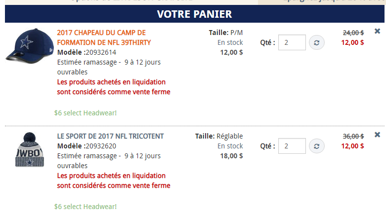 Alors le site Internet Lids.ca nous présente les items de notre panier et… oooh surprise! Les items de notre panier sont maintenant rendus à 12$ chacun. Hé bien non, ils ont mis 2 casquettes et tuques dans le panier, 6$ multiplé par deux items donnent 12$. Nous ne savons pas pourquoi.